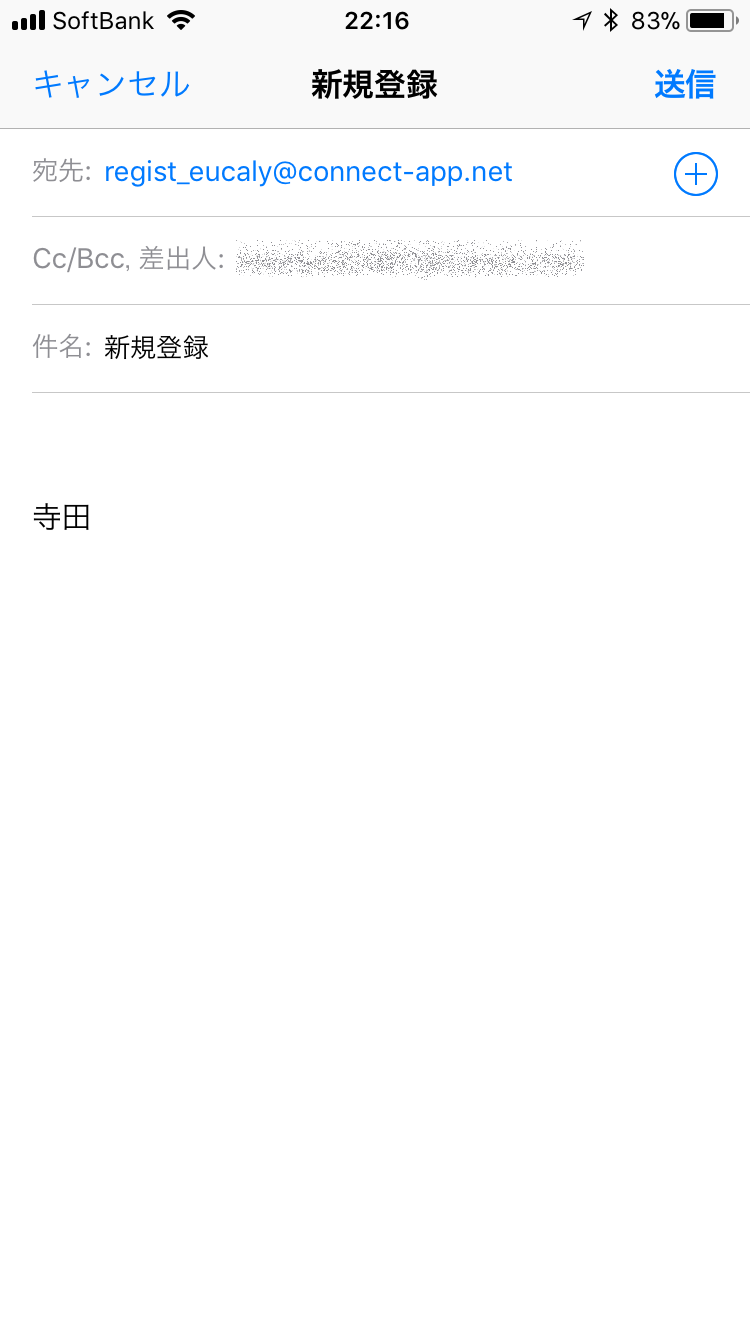 新規登録は、iPhoneの場合、そのまま、左上の送信ボタンを押して、空メールを送信するだけで、OKです。